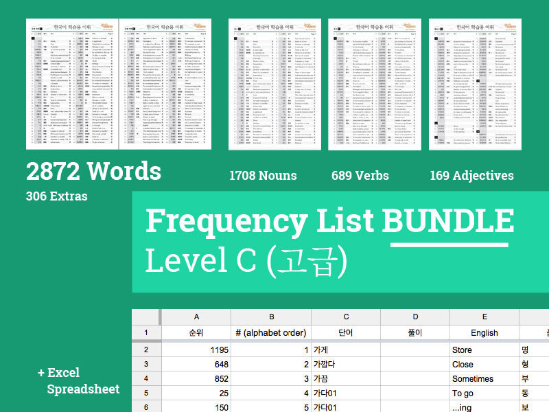 This is the COMPLETE Level C Korean Frequency List Bundle. It includes EVERYTHING from the Level C Frequency List found on the National Institute of the Korean Language's website: